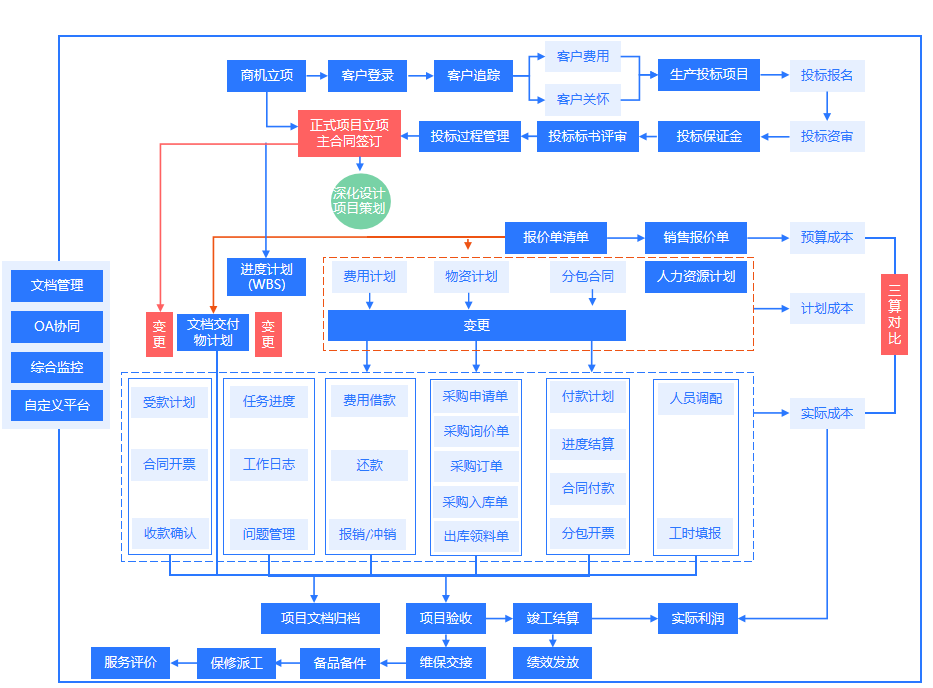 系统以成本控制为核心,以合同和进度控制为主线,实现设计、招投标、成本、进度、合同、资金、内部银行、质量、安全等业务一条线管理,以及人力资源、财务、物资、甲供材料等资源管理,并扩充到办公自动化、管理仪表盘、电子商务(B2B、O2O)等功能。通过“关键控制点”与“工程主协调单元”对流程任务的各项指标进行监控,通过决策与执行的一体化,打造企业有效的反馈体系,实现职能型向流程型的管理转变,率先在国内开创工程项目管理软件的成功应用模式:决策+控制+协调+执行=工程业绩。